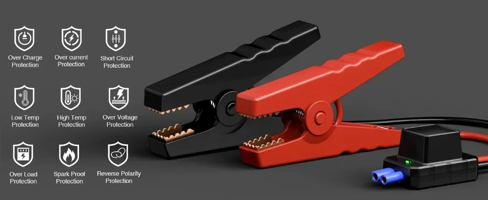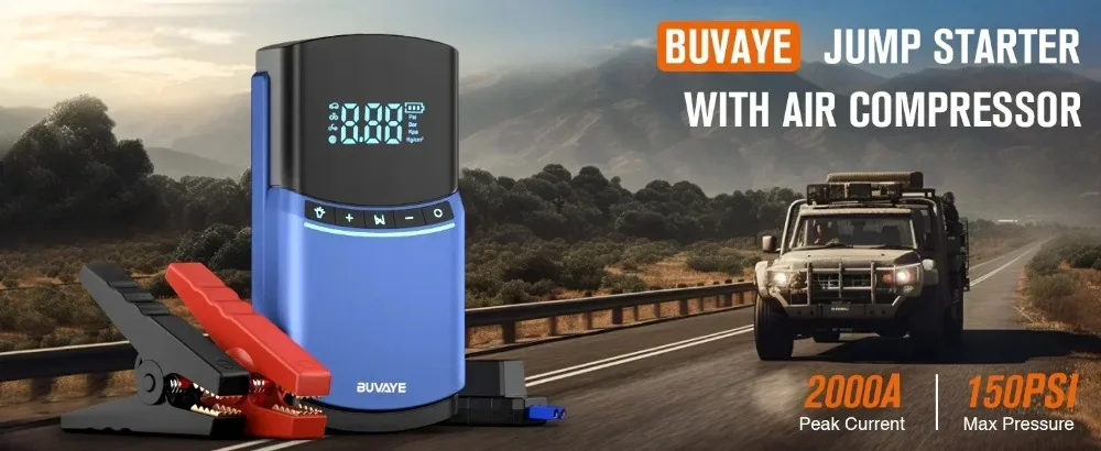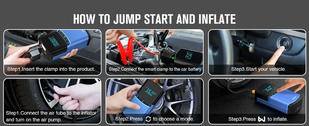 The built-in 10,400 mAh high-capacity polymer battery can provide a peak current of 2,000A and support the starting of diesel vehicles with a displacement of less than 5.0L Diesel and all 12V cars. Inflates 4 car tires from 0-36 PSI or 12 car tires from 28-36 PSI on a single charge. When fully charged, it can start the car for more than 20 times!