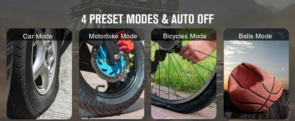 The car tire inflator has 4 preset inflation modes (car, bicycle, motorcycle, ball game, outdoor air bed, etc.), making it easy for beginners to choose. Manual mode allows you to set the pressure value (3-150psi) based on the object being inflated. Simple to operate and easy to use, it can meet your various inflation needs. Plus, its small size makes it easy to fit in your car, bike rack, or backpack.